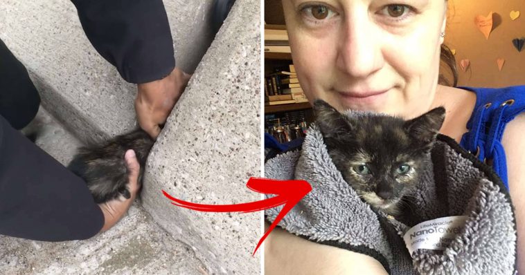 It was clear that Gamblain’s suspicions were absolutely correct. The fuzzy black ball was indeed a kitten, and the poor little thing was trapped headfirst in a cracked barrier.