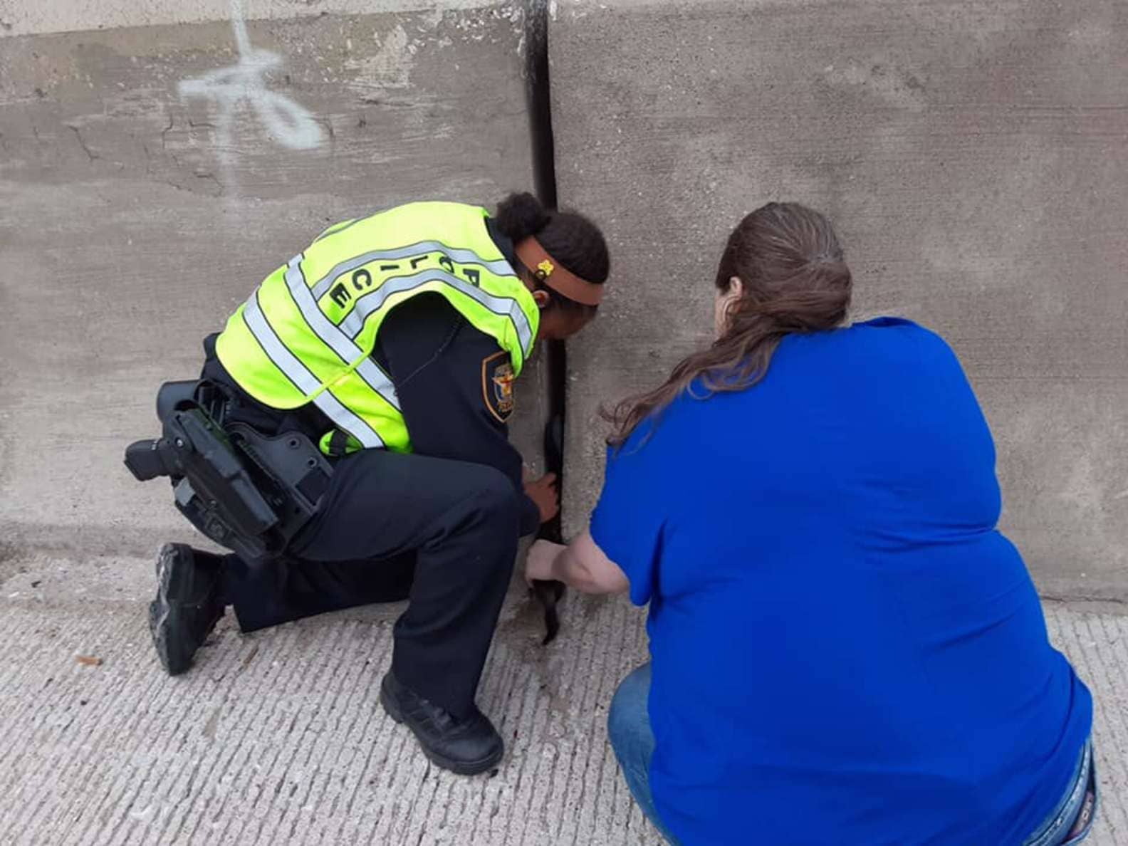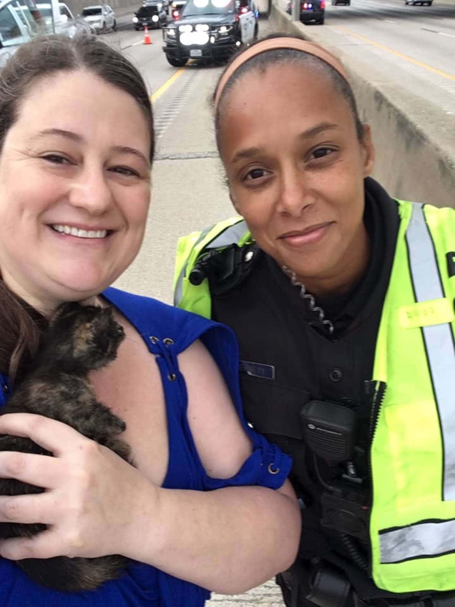 As Gamblain tried to safely free the kitten, a highway patrol named Officer Bennet arrived to help her. A few minutes later, a few cops came to divert traffic so that the tiny kitten could be rescued safely.