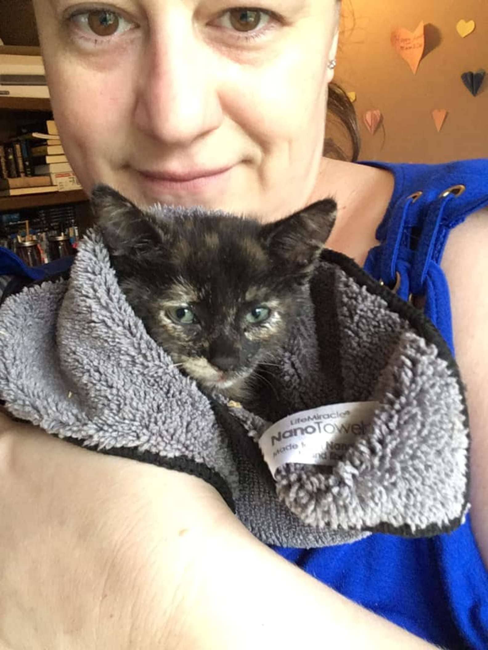 The kitten was named Jersey and is now settling into her new home. She couldn’t be happier that she found a forever home and a beloved mom. Her happy life is just beginning!