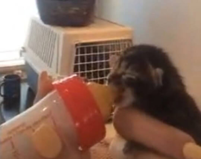 When the kitten arrived at the vet’s office, he drank a full bottle of milk. Thankfully, he was miraculously unharmed, he was just bruised on a few spots. “It is amazing how he escaped with no broken bones but when they’re little they’re very pliable. It was his lucky day!”