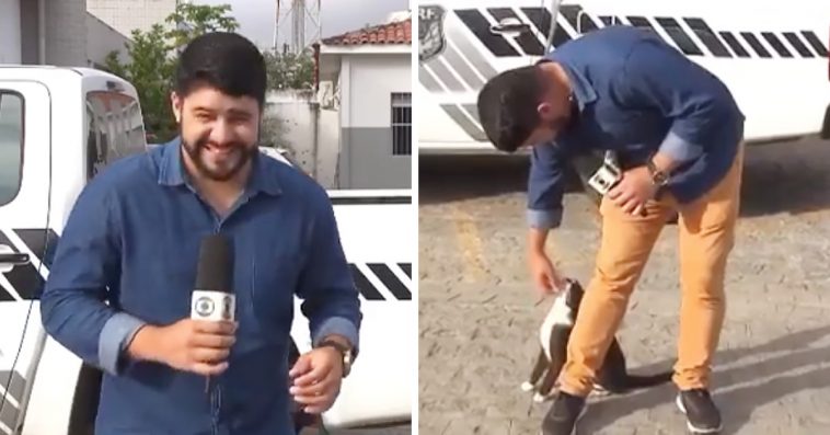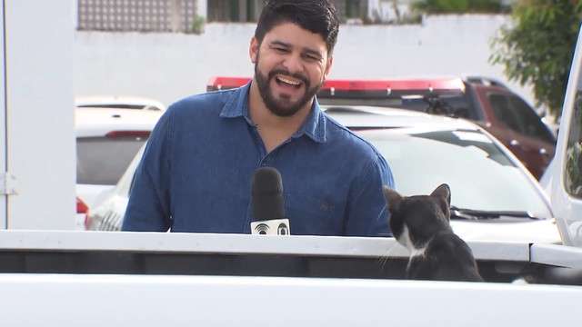 Reporter Artur Lira of TV Paraiba in Brazil was filming a news segment outside a police station when a cat appeared at his feet. The cat interrupted his shoot to demand both his and the camera’s attention.