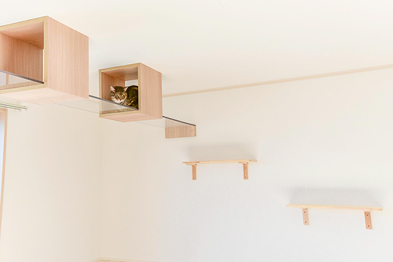 The walls of the apartments are fitted with shelves and boxes that cats will love to climb, play on and cuddle up inside.