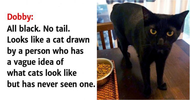 “Dobby: All black. No tail. Looks like a cat that was drawn by a person who has a vague idea of what cats look like but in reality has never seen one.”