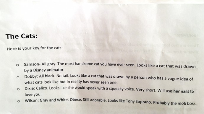 21-year-old Amanda agreed to take care of her friend’s cats for just one night, and she got an hilarious note describing the four cats’ respective characters from her.