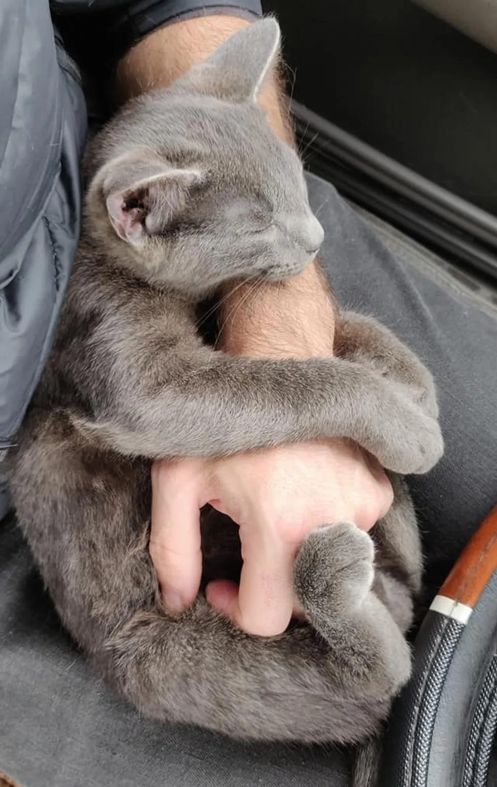 On the way home, the kitten wrapped Jason’s arms and fell asleep in his lap. “He was naturally super friendly and sweet,” Jason said.