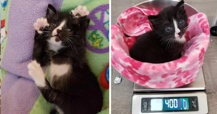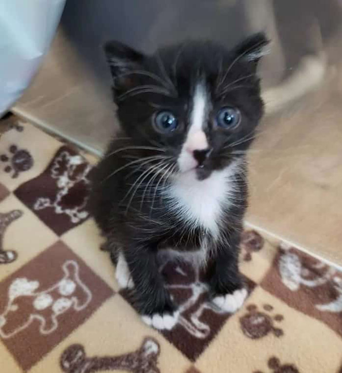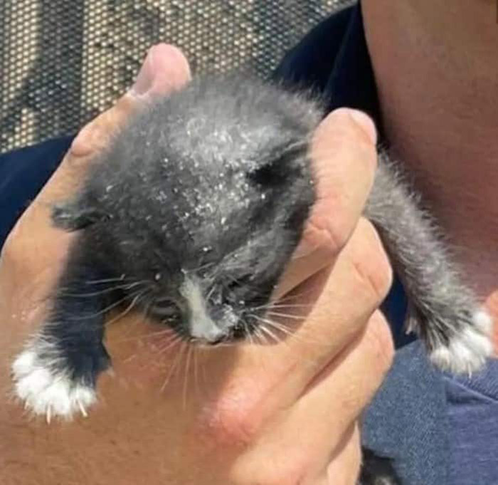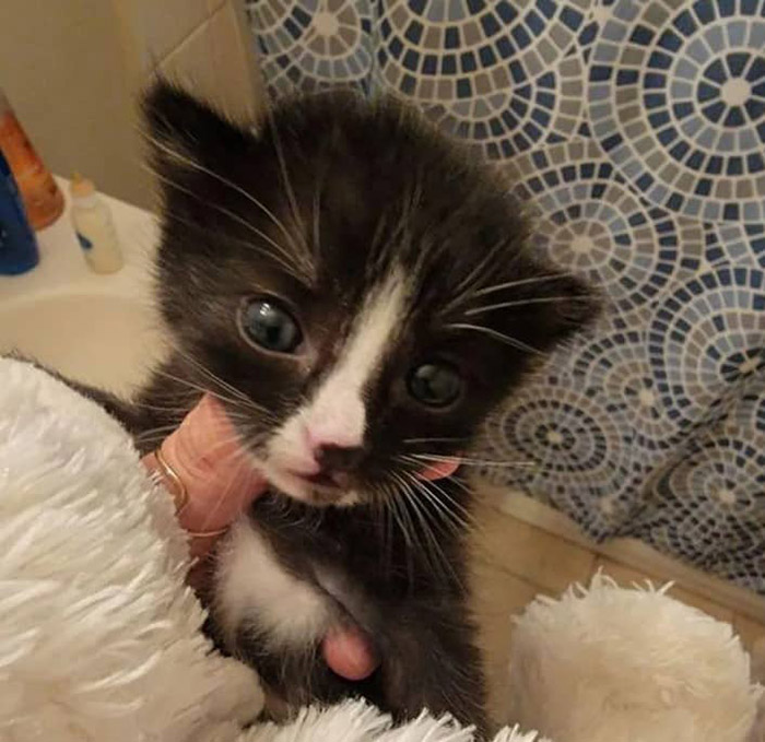 Kittens are pretty adventurous when they open their eyes, and they can wander off in many directions. A few months ago, a volunteer named Erin from Wrenn Rescues in LA received a call about a kitten who had quite the adventure. The black and white cutie was exhausted and covered in slime and dirt after being found stuck in a drain.