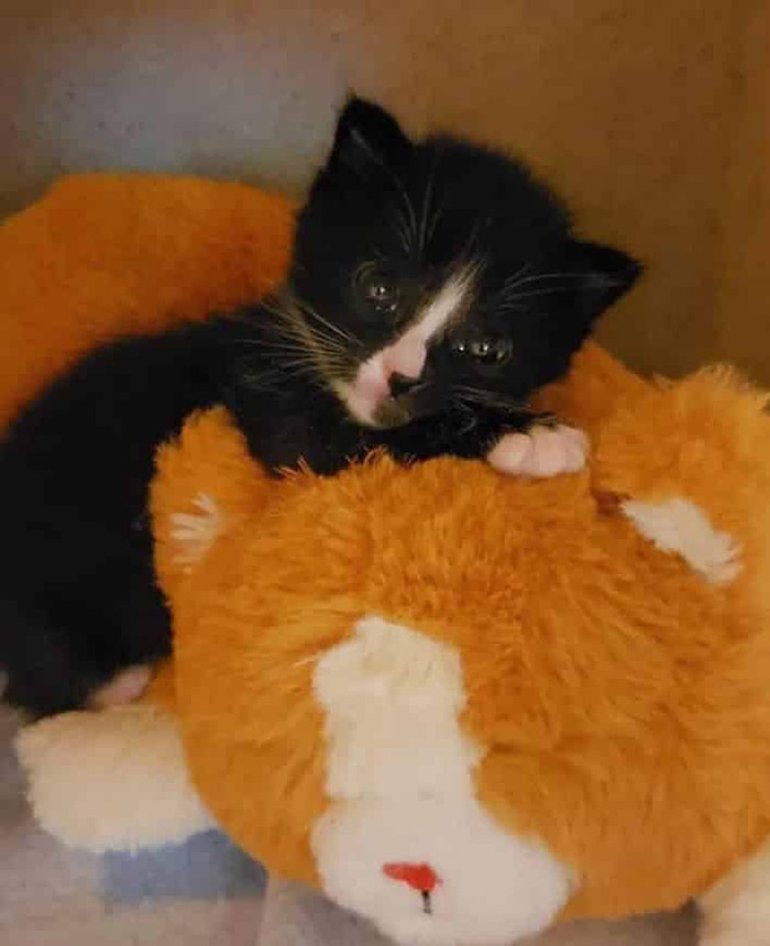 It didn’t take long for Jojo to start gaining weight and playing around. After the tube feedings, the kitten was strong enough to eat on its own. It stayed at the shelter for a couple of days before it was medically clear. To make the transition easier, Erin gave her a faux momma cat with a heartbeat and a heat source.