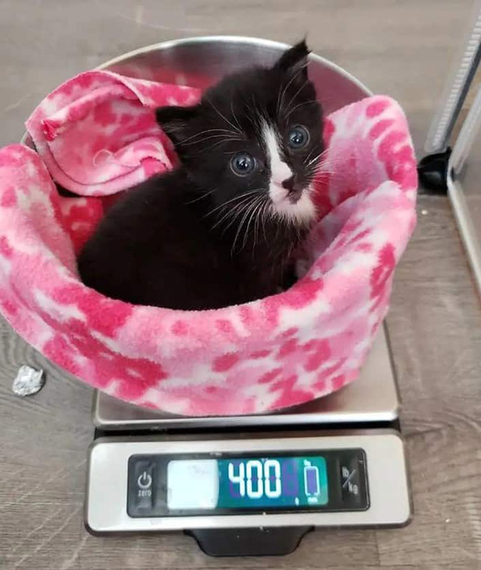 Erin took the poor kitten in and realized that it was too small to eat. They had to insert a feeding tube to help it regain the energy it lost. After a few full bellies, the tiny tuxedo-like kitten showed its character. They named it Jojo and she began making strides the moment she was out of the woods.