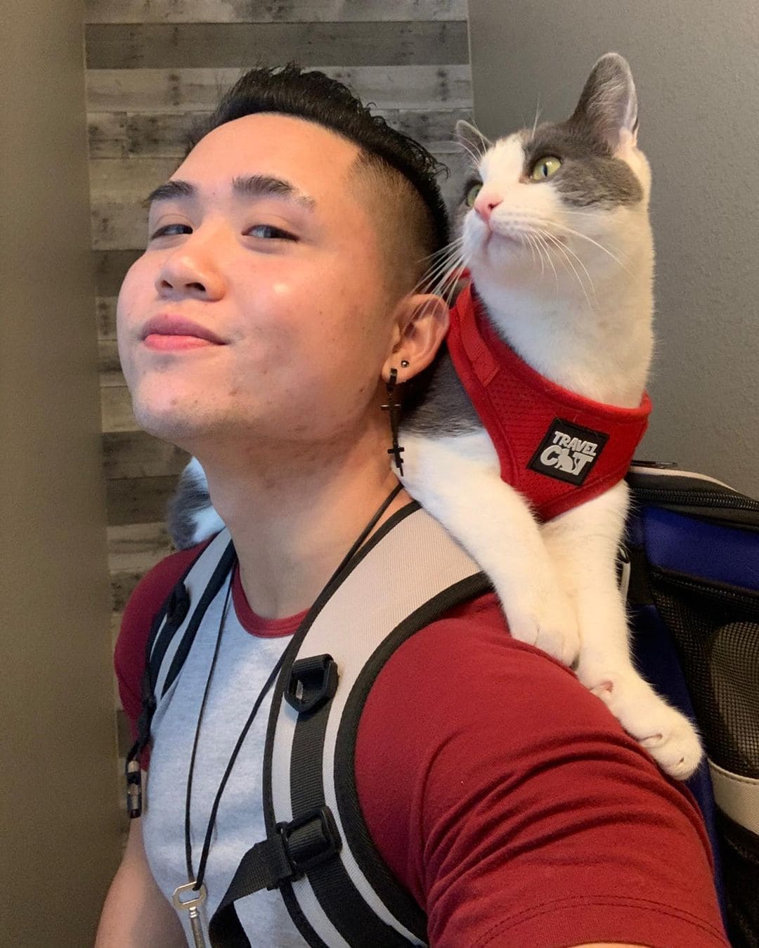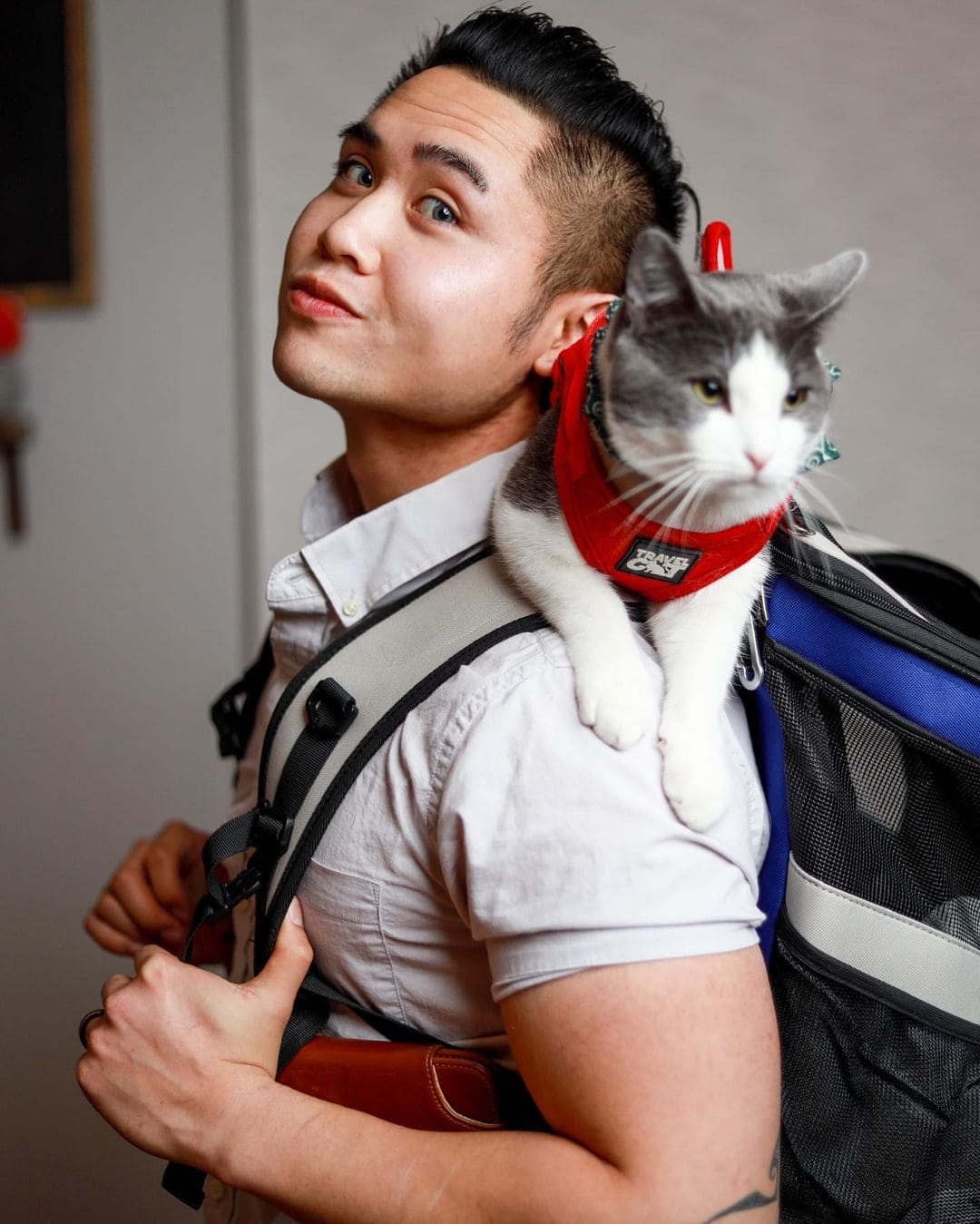 Jo doesn’t want to leave Leo alone, so he takes him anywhere he goes. “He is a big boy, but he still acts like a kitten. He is so cute. Leo is really affectionate. He’s really adventurous, and he has a super bubby personality.”