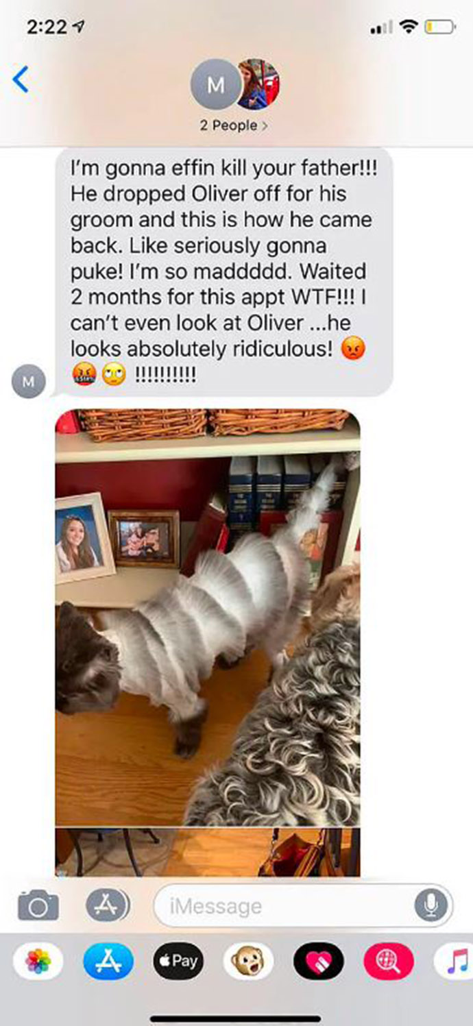 “I’m gon na effin kill your dad!!! He dropped Oliver off for his groom as well as this is exactly how he returned. Like seriously gon na throw up! I’m so maddddd. Waited 2 months for this [appointment] WTF!!! I can not also look at Oliver … He looks absolutely absurd,” the message said.