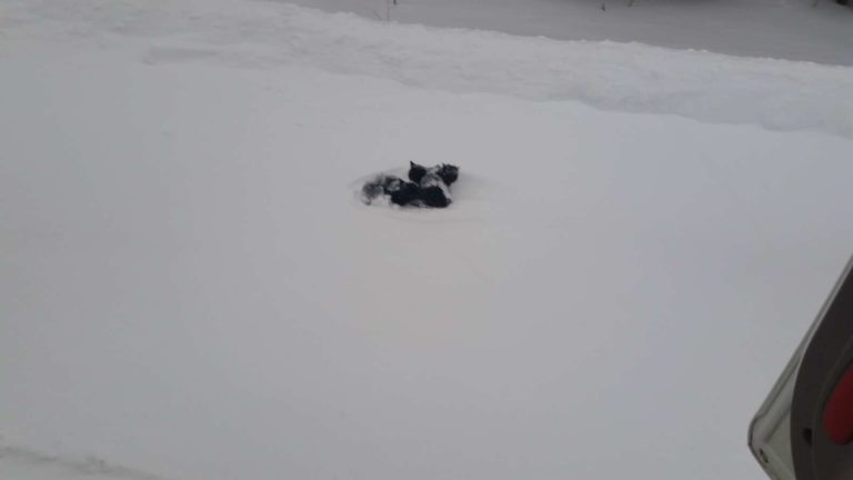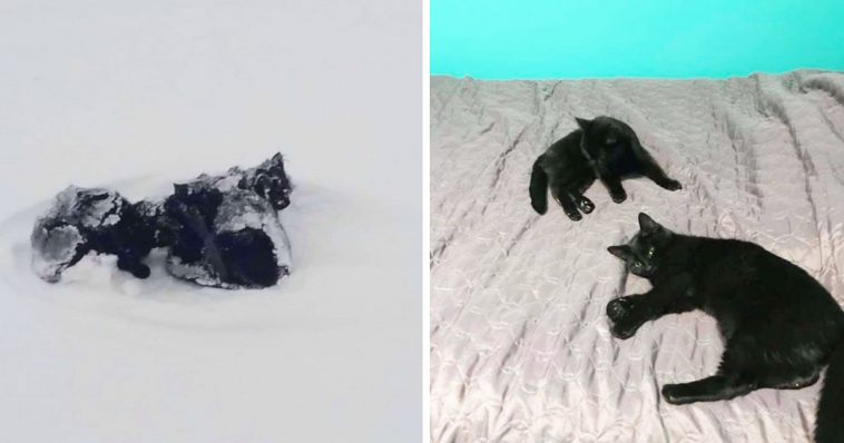 In the snow, three small black kittens were snuggled together. They were also surrounded by no paw tracks, indicating that they had been tossed there from the road.