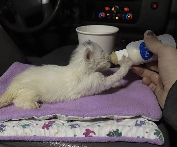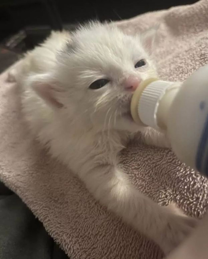 Kittens as young as this need to be fed every two hours, you also need to be their mom by rubbing their bellies to get their digestive system working properly – and then of course you need to clean up the poop!