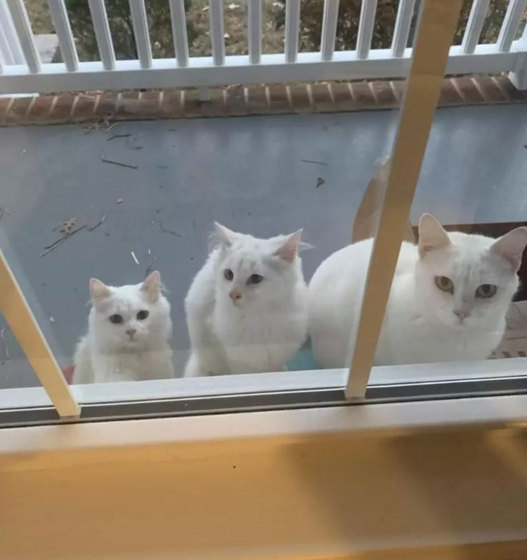 A stray cat named Mama Ally, along with her two kittens, arrived on the doorstep of a North Carolina residence and peered through the window.