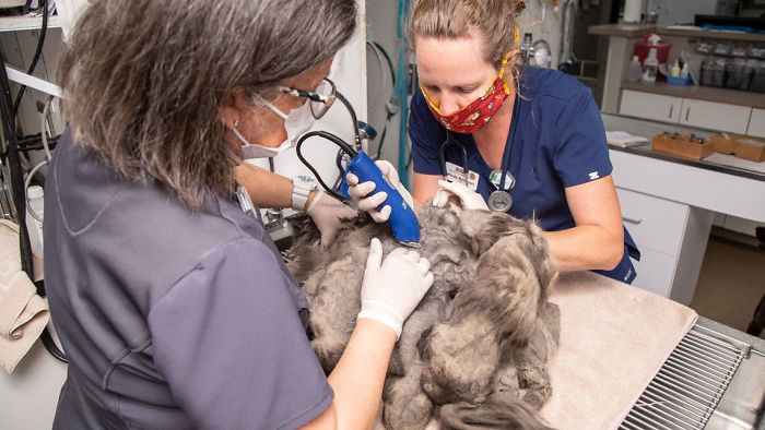 Bretta told that the AHS’ Emergency Animal Medical Technicians received a call for help after Fluffer’s owner passed away. According to Bretta, it took around an hour to remove Fluffer’s matted fur.