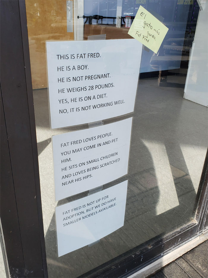 “I just happened to look down and read the funny posters as I was passing by. I immediately walked to the window to see if Fred was there because, you know, who doesn’t want to see a 28lb cat?”