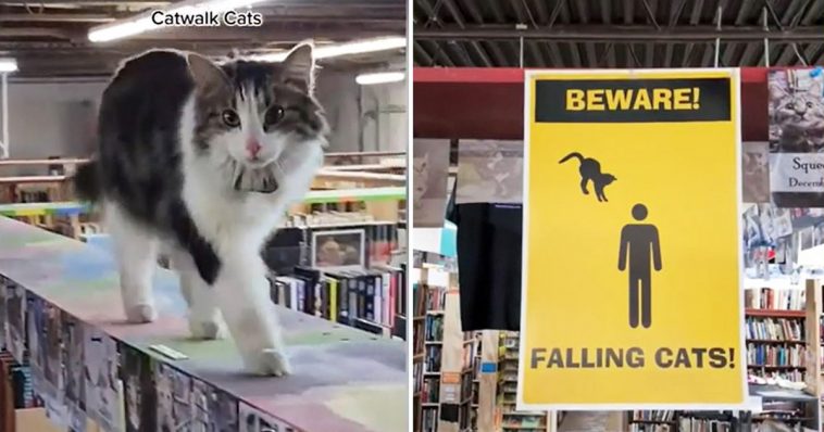 Have you ever seen cats falling down like rain in the sky? It’s all fantasy, of course, but one bookstore has such a specific problem with a group of cats roaming wild on walkways above it. A video of the cats walking above customers’ heads in the Cupboard Maker Books store was recently posted on TikTok. It went viral right away, of course, as soon as the store’s owner Jason Haring posted it on his profile.