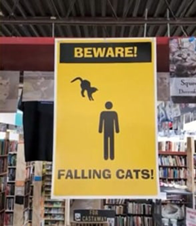 The three cats, Zak, Annika, and Mouse, are living above the store and walking on custom-made pathways. They don’t really fall off the ceiling, but to make things interesting, Jason has posted a sign that says “Beware! Falling Cats!”. Everyone looks up when they see it, and to their delight, they see cats roaming the walkways like they don’t care.