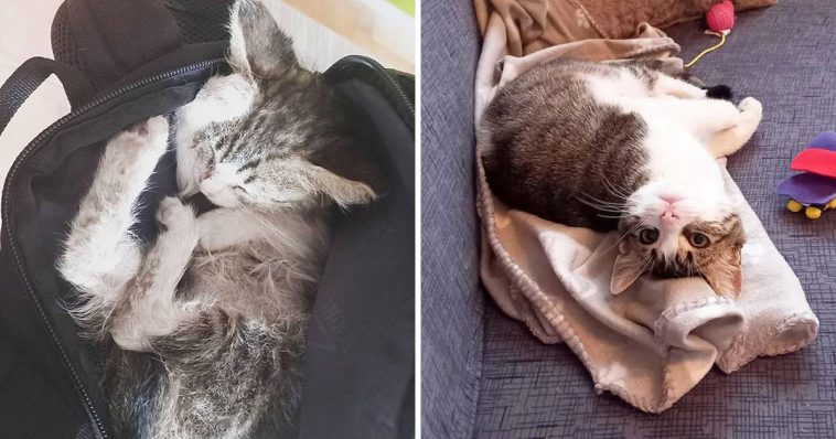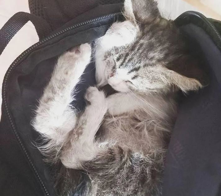 Matea carefully placed the kitten in her backpack, so she could safely transport him. The tabby was just skin and bones but so content and relieved that he slept through the entire ride home.