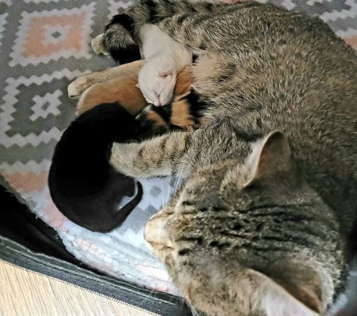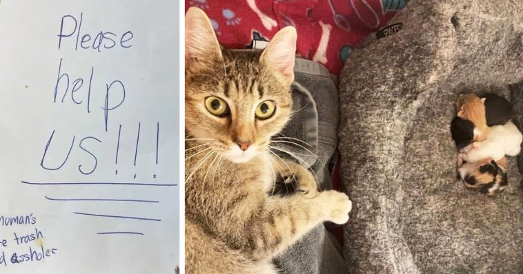 A cat who was found outside with her newborn kittens and a note, is so grateful to be helped.