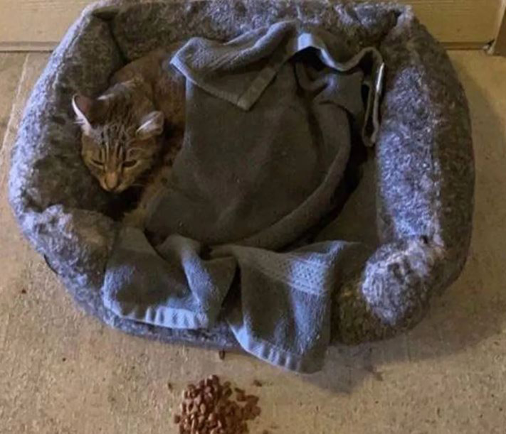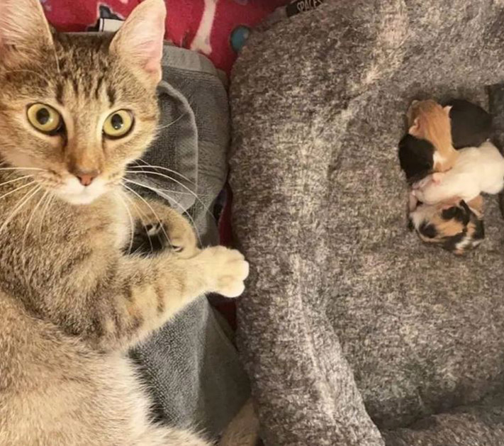 She found the cat in a bed with a towel draped over her and a sign taped to the wall above her. “When the towel was lifted Kayla discovered three tiny newborn kittens underneath the cat.”
