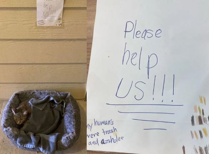 The distressed tabby had been left outside while she was in active labor. The sign above her was a plea for help (in large print that read “Please help us!”). Kayla and her coworker rushed to their aid and brought them into their office.