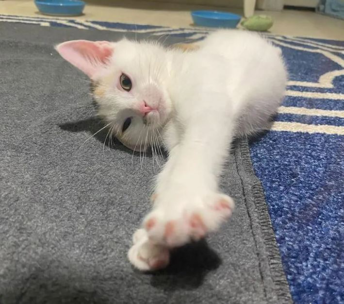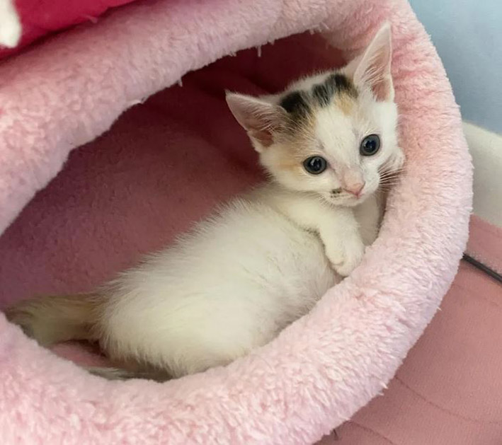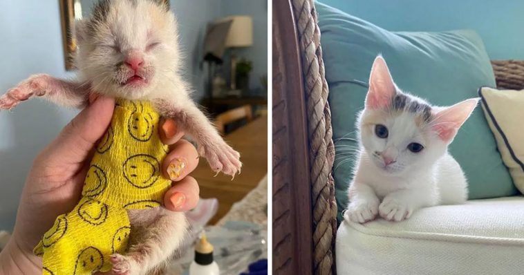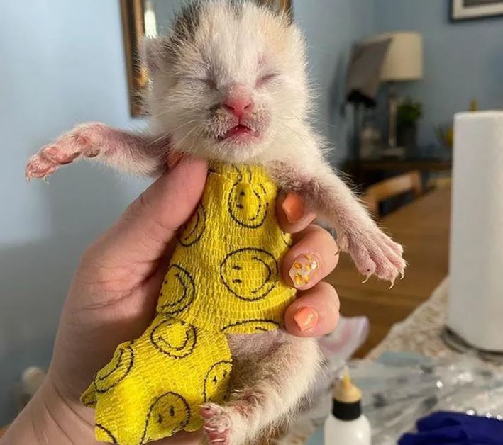 A tiny kitten was found in a family’s yard without a mother and other siblings. She was around 6-7 days old and missing majority of a rear leg. A Good Samaritan posted a plea for help online, as the kitten desperately needed medical attention.