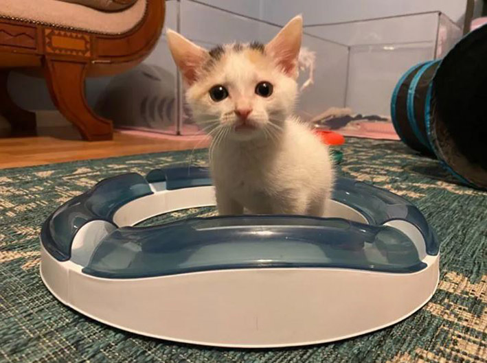 Over the next few weeks, the kitten continued to make strides and surprised her foster mom and the vet with her progress. At five weeks old, Jack was up on her three paws, walking, playing and trying to climb anything she could lay her paws on.
