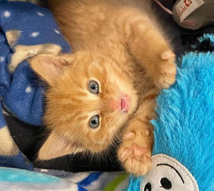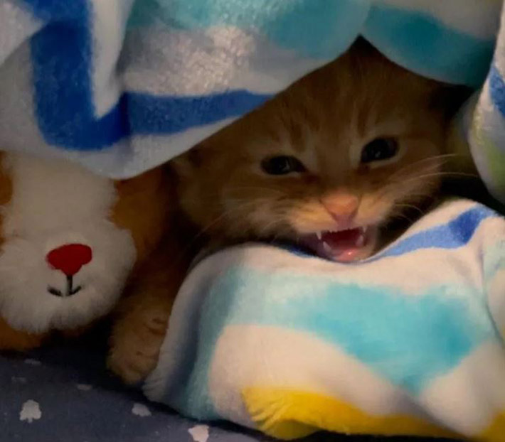 A tiny orphan kitten has transformed from hiding under blankets to now ‘roaring’ for attention.
