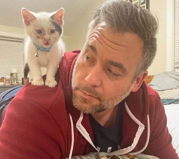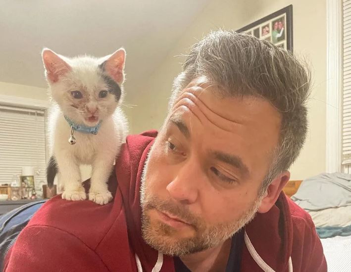 A kitten turned into a happy, affectionate shoulder cat after a family helped him see through both eyes again.