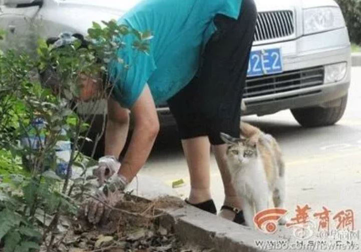 Mrs. Yang buried the two kittens, while the mother looked mournfully on.