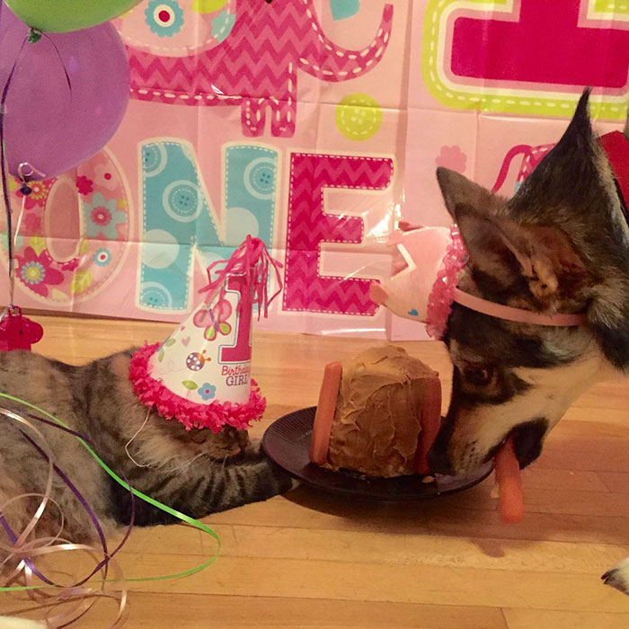 Raven was presented with 4 kittens and none of them showed much interested in her except one fluffball named Woodhouse – they immediately knew she was the one. It was the day when Woodhouse got not only a home but a best friend, too. One year has passed since then and the two are still inseparable! “They are perfect with each other. They don’t cuddle as much as they used to when they were a puppy and kitten. But they’re still always together, always playing together.”