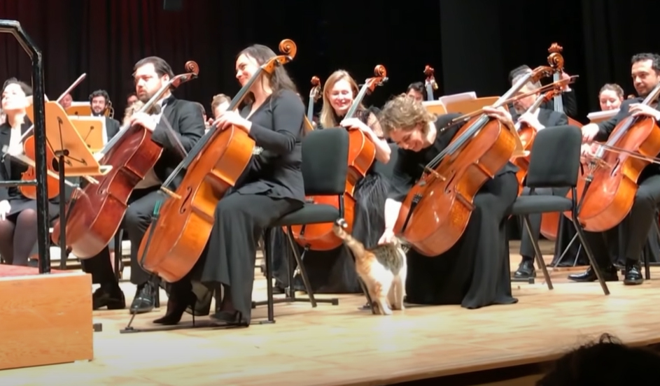 Before the show officially starts, this bold cat wanders onto the stage and immediately gains her very first fan – a blonde cellist.