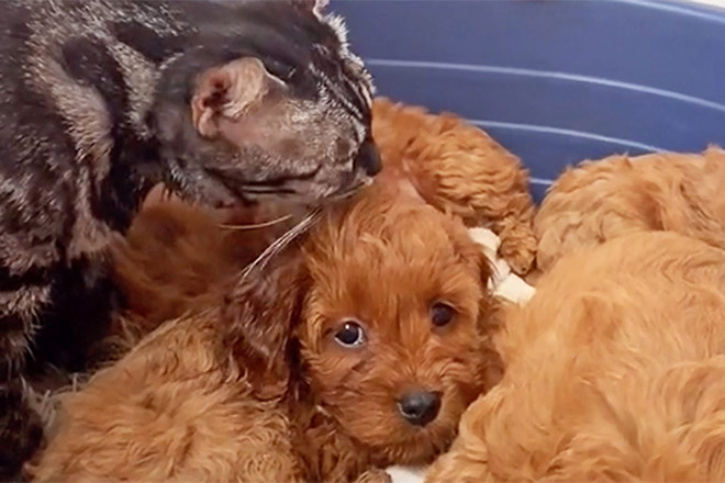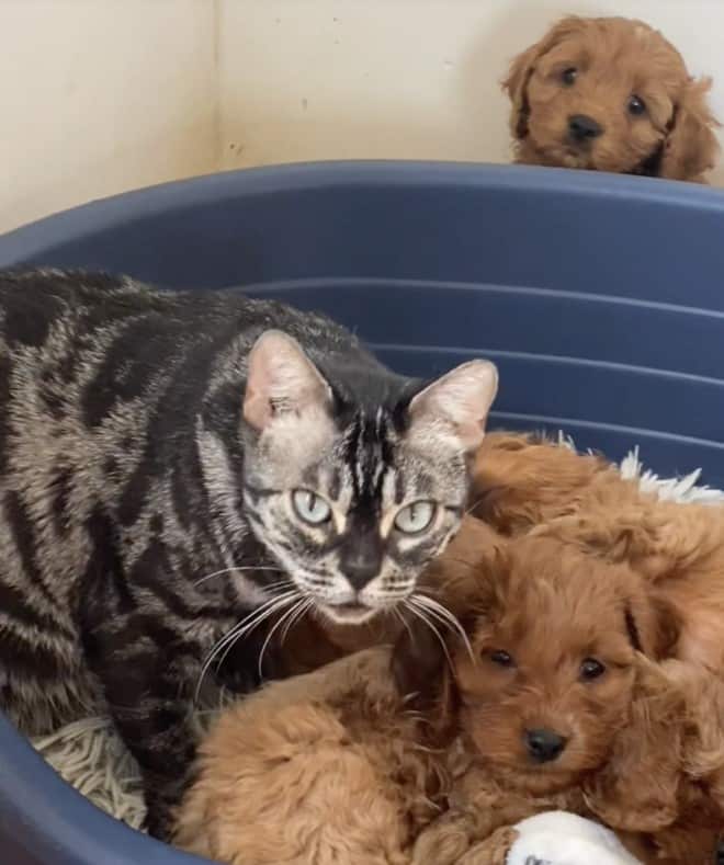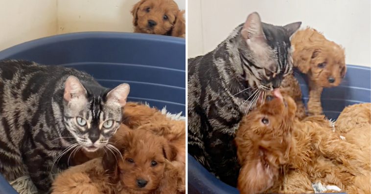 The story was shared online by TikTok user @kiwigirlxoxox. Her cat lost a litter of kittens back in March and she was depressed. Soon after, her dog gave birth to a litter, and the cat was very interested in them. She would come to them every day and clean them up, and the dog didn’t mind. After a while, @kiwigirlxoxox realized that she was trying to mother them.