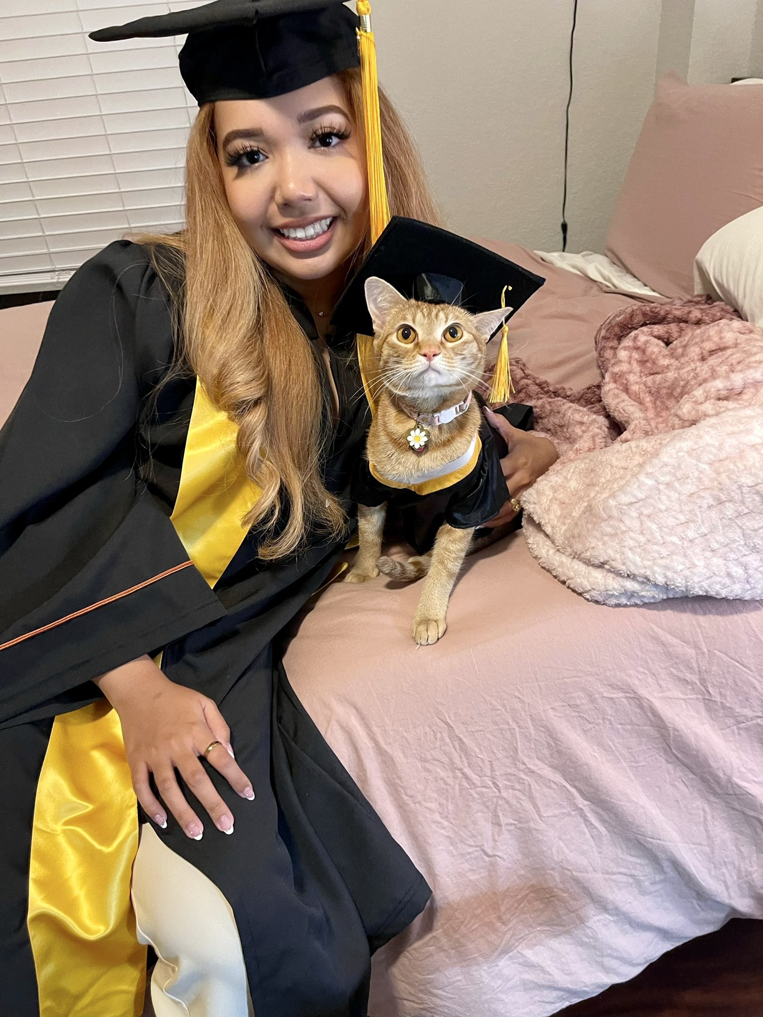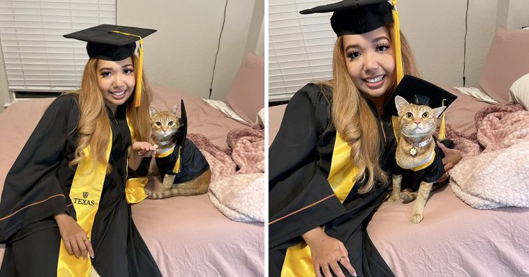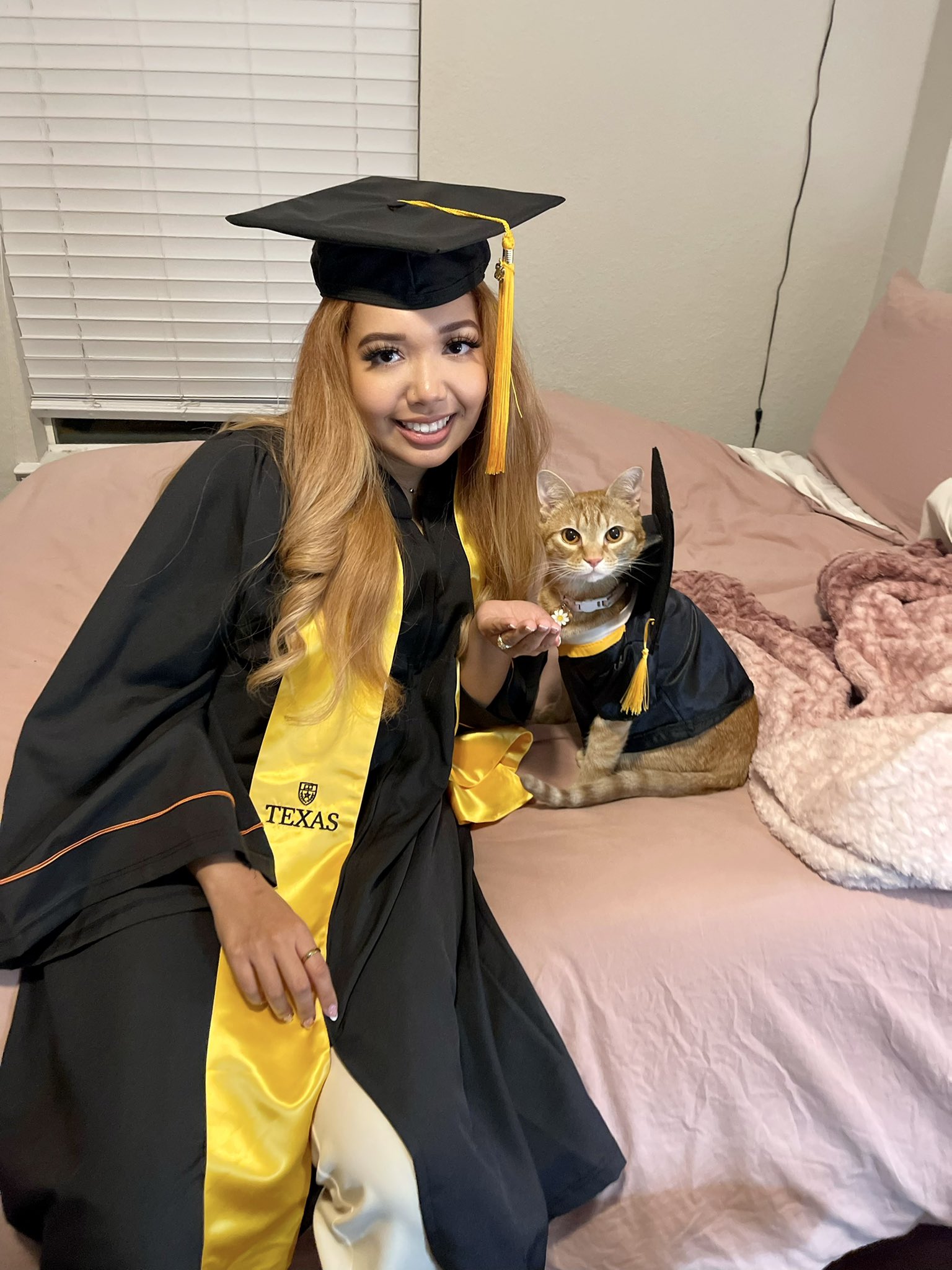 When it came time for Bourdier to graduate from the University of Texas at Austin she searched online for a cap and gown fit for a one-and-a-half-year-old cat.