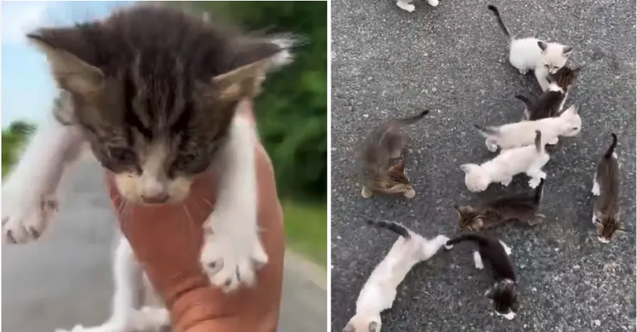 He decided to video the rescue on his phone and as soon as he picked up the kitten, another six came bounding out of the bushes by the side of the road toward him.