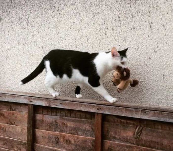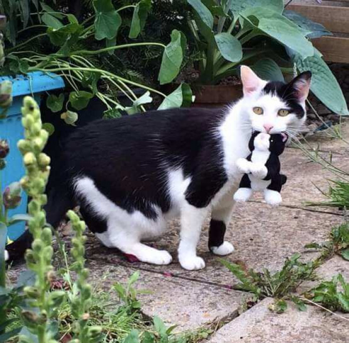 Meet Pixie, a beautiful 12 year old Tuxedo cat that lives with her human, Beth Wilson, in the UK. Like all cats, she loves going out and exploring everything around her. She is also in love with plush toys and inanimate birds and it would seem that she wants to share her little adventures with her toys too!