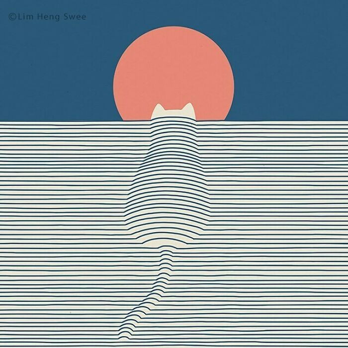 The style here is very modern with minimalism which brings out the beauty in his designs. Lim Heng Swee feels cats are very mysterious animals and we tend to agree. He loves their curious, calm, and relaxed personalities and feels soothed while observing them, the main reason behind his obsession. He has found that cats blend seamlessly and purrfectly into natural landscape scenes which is the inspiration for this series of cat landscape artworks.