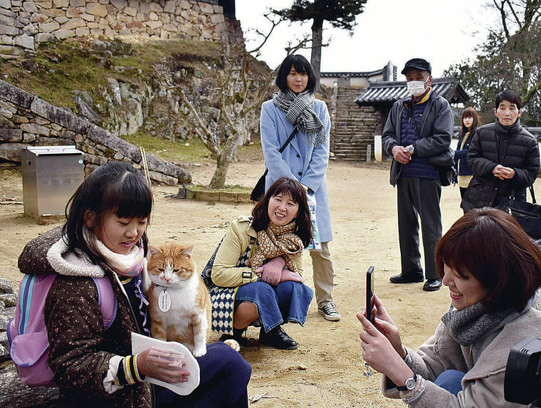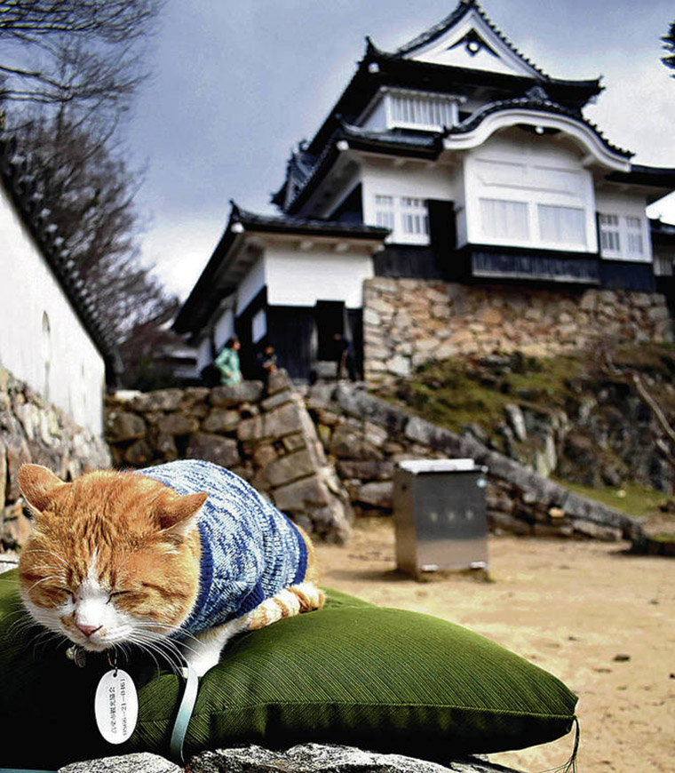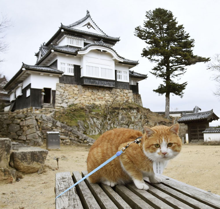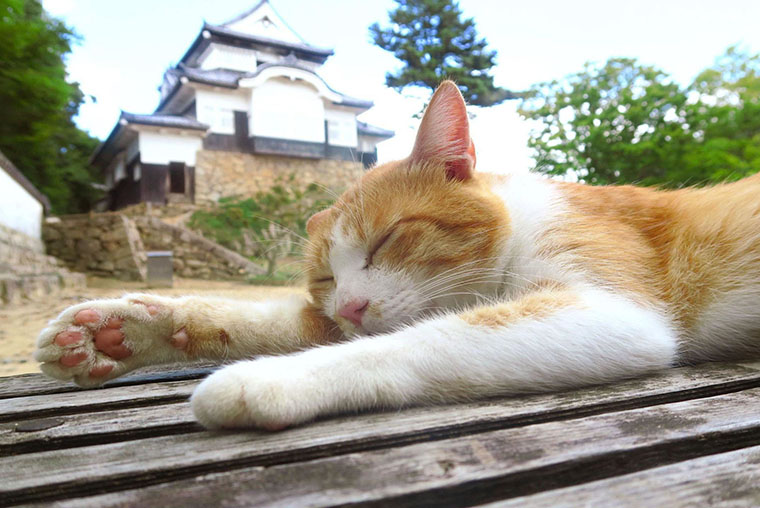 He settled in the precincts of the castle in the wake of the torrential rains last July. Sanjuro’s love for people has generated social media attention, which in turn has increased the number of tourists coming to visit the castle. Attendance fell drastically after the rains but has been recovering rapidly thanks to the friendly cat.