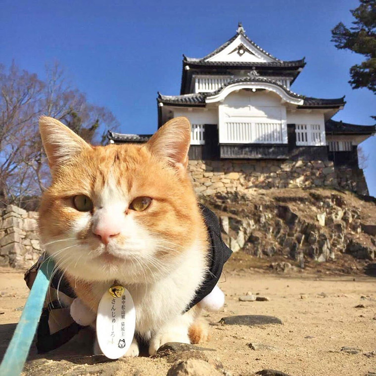 After watching the cat for some days, Motohara started feeding him. From that point on, Sanjuro then began appearing in the main area of the castle, mingling with tourists. The cat didn’t mind people touching him at all and even purred. He quickly became widely known through word-of-mouth and online. The tourist association decided to name him Sanjuro in tribute to Tani Sanjuro, who was a samurai warrior of the Bitchu Matsuyama clan. Sanjuro actually served as a troop captain of Shinsengumi, a samurai squad in the last years of the Edo period (1603-1867).