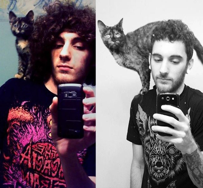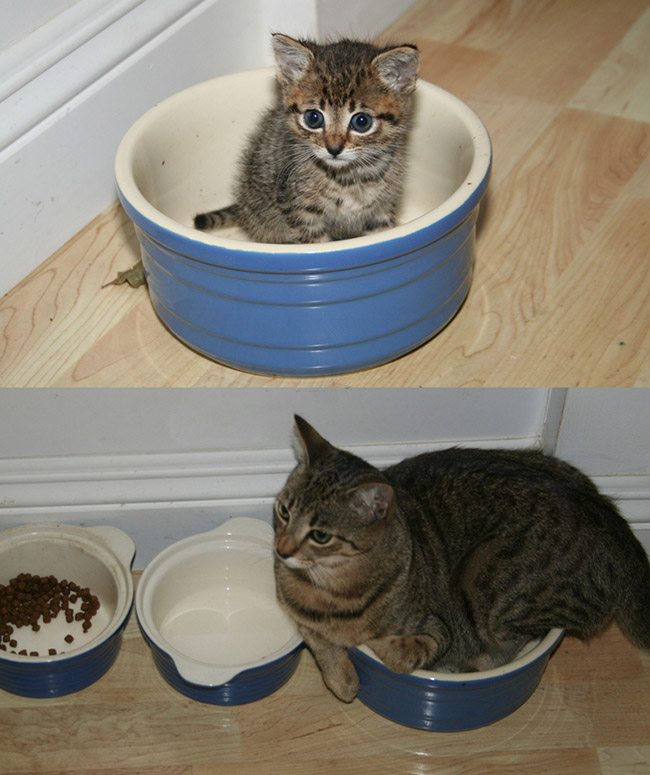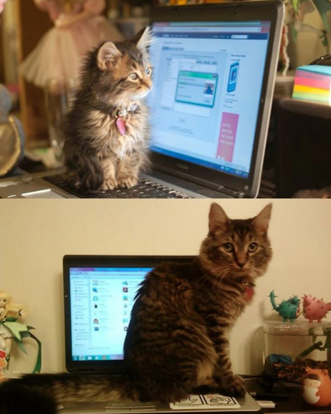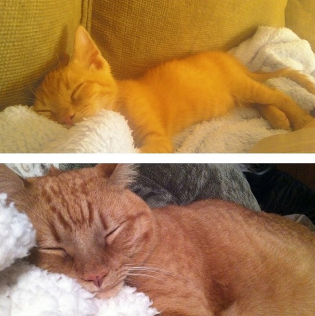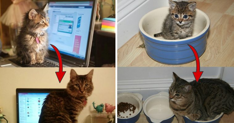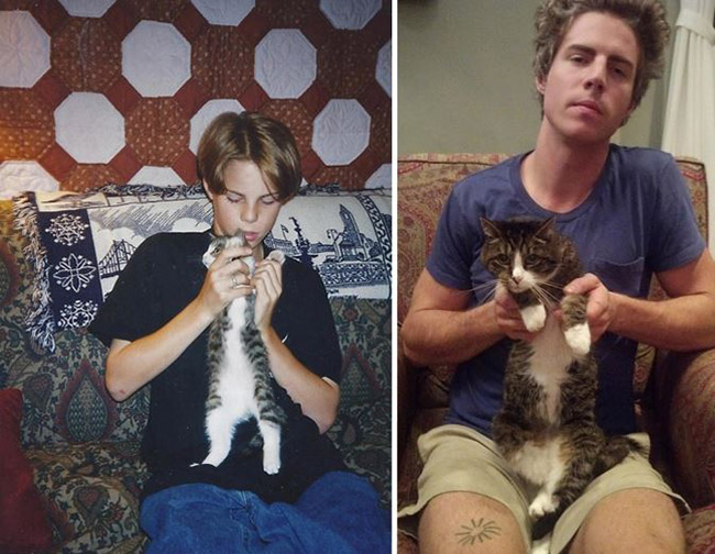 You know those pictures of people when they were babies or kids, and then they re-create them as adults? Well, these are the kitty versions. These cats recreate their most valuable kitten memories, as adults, and it’s oh so adorable. It’s also a little sad, because you see how much they’ve aged. But, we also see how valuable a cat is in their human’s life. And, how their “me, me, me” attitude stays with them for life.