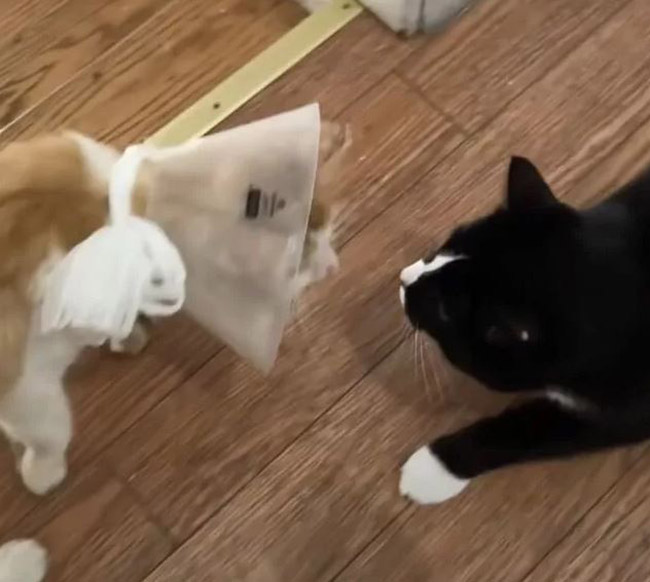 The next morning they took him to see the emergency vet and thankfully he didn’t have any major problems or sickness. He was fitted with a collar to stop him scratching his sores and then it was time to take him home.
