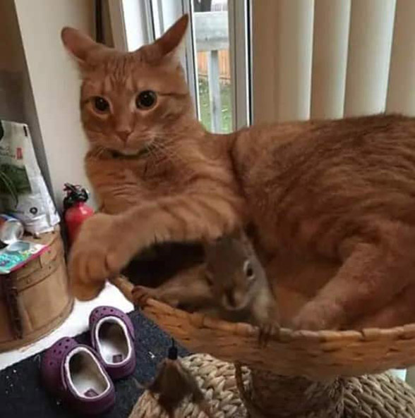Mel and Will weren’t looking for a new pet. They already had Jack the cat, and weren’t sure how they’ll get along. They named the squirrel Tommy and decided to show it to Jack. Jack was very anxious to meet his new bud, being all affectionate about him. Jack is a sweet and mellow cat, so he hit it off well with the bit-of-afraid squirrel pretty fast.
