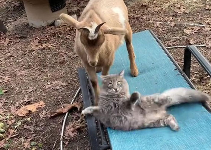 Being tiny enough to fit in the palm of her hand, it had no problem running straight through the holes in their fence. Jan ran after the adorable little creature in order to find it but couldn’t. Thirty minutes later, the kitten was back and lying right next to the goats. Thus began the adventures of the kitten they would name GG, the Gray Goat, and, truthfully, he couldn’t have come at a better time.