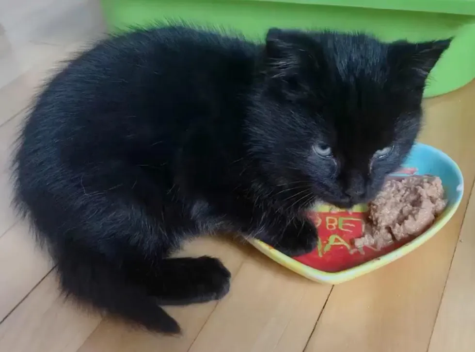 The resident brought the kitten inside her home and provided food and warmth. The little one was a bit shaken but began to calm down, knowing that he was safe. He was so hungry that he scarfed down every morsel in front of him, and even let out a tiny purr when he was wrapped in a warm towel.