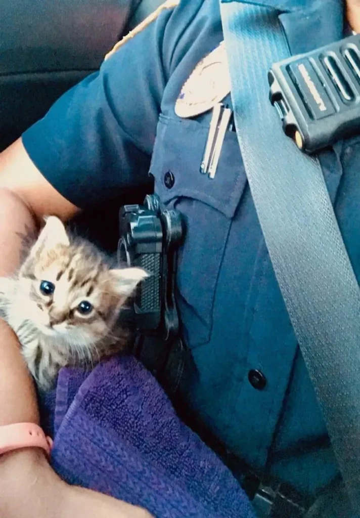 A stray kitten snuck his way into a police officer’s heart and insisted on being her cutest shoulder cat.