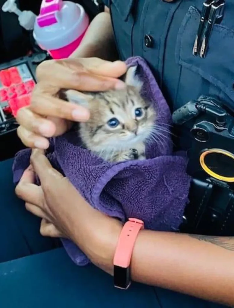 Hoping to find the kitten’s family, the officers began to ask around the neighborhood while they searched for a mother cat and other kittens. After much effort, no one came forward to claim the tabby, and it became clear that the kitten was by himself and had no home to go to.