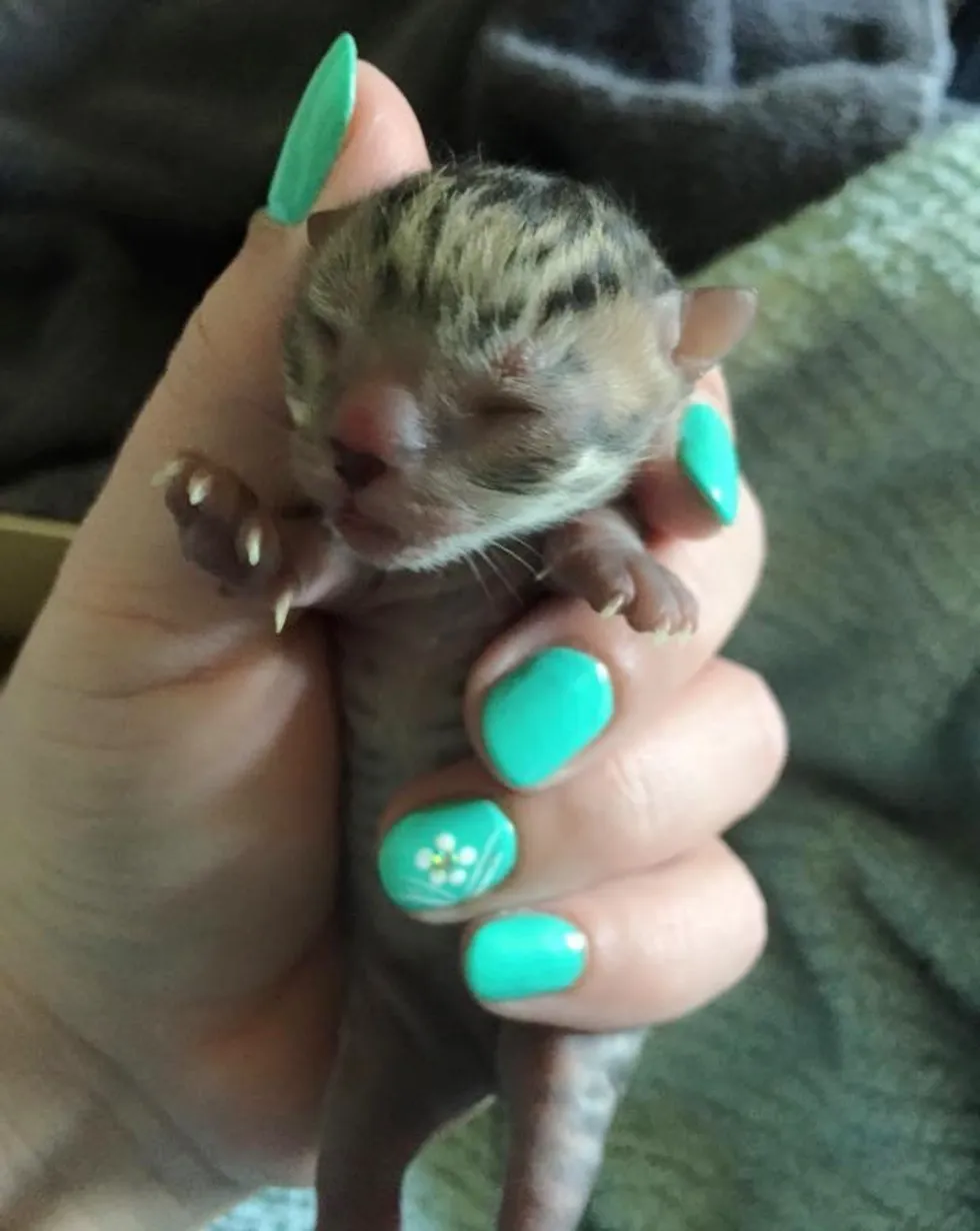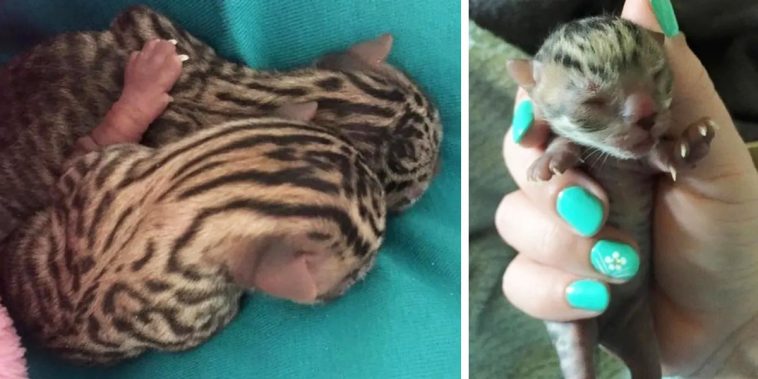 Two newborn kittens were found in a barn in Gaston, Indiana. Their eyes had not yet opened when Alicia Jones spotted them. What caught her eyes immediately was the kittens’ markings which resemble those from an exotic wild cat.