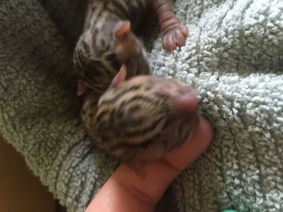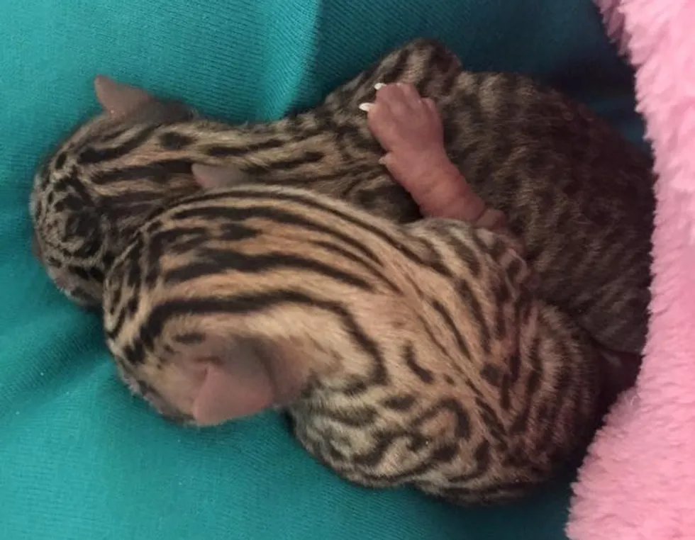 They are still trying to determine the breed of the kittens. So far they have ruled out a few options: tiger (too small to be baby tigers), bobcat (have long tails). It’s likely that they are Bengal or Savannah cats – domestic and wild cat hybrids.