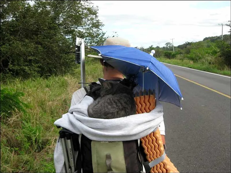 A pet cat is accompanying her owners on a mission to tour from Miami to Ushuaia, Argentina on foot on a $2,000 budget per year for about two to three years. Since they can only stay in the U.S. for 85 days, they are walking about 20 miles per day to get their goal accomplished. The French couple and their cat started their trip in Florida, then we’re headed west to Alabama, Mississippi, Louisiana and Texas.