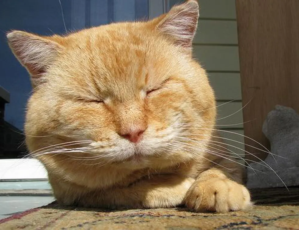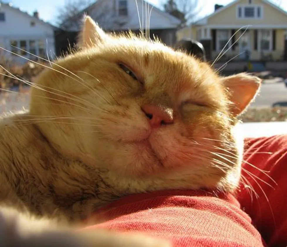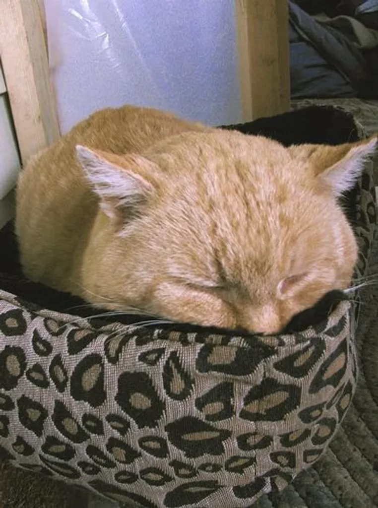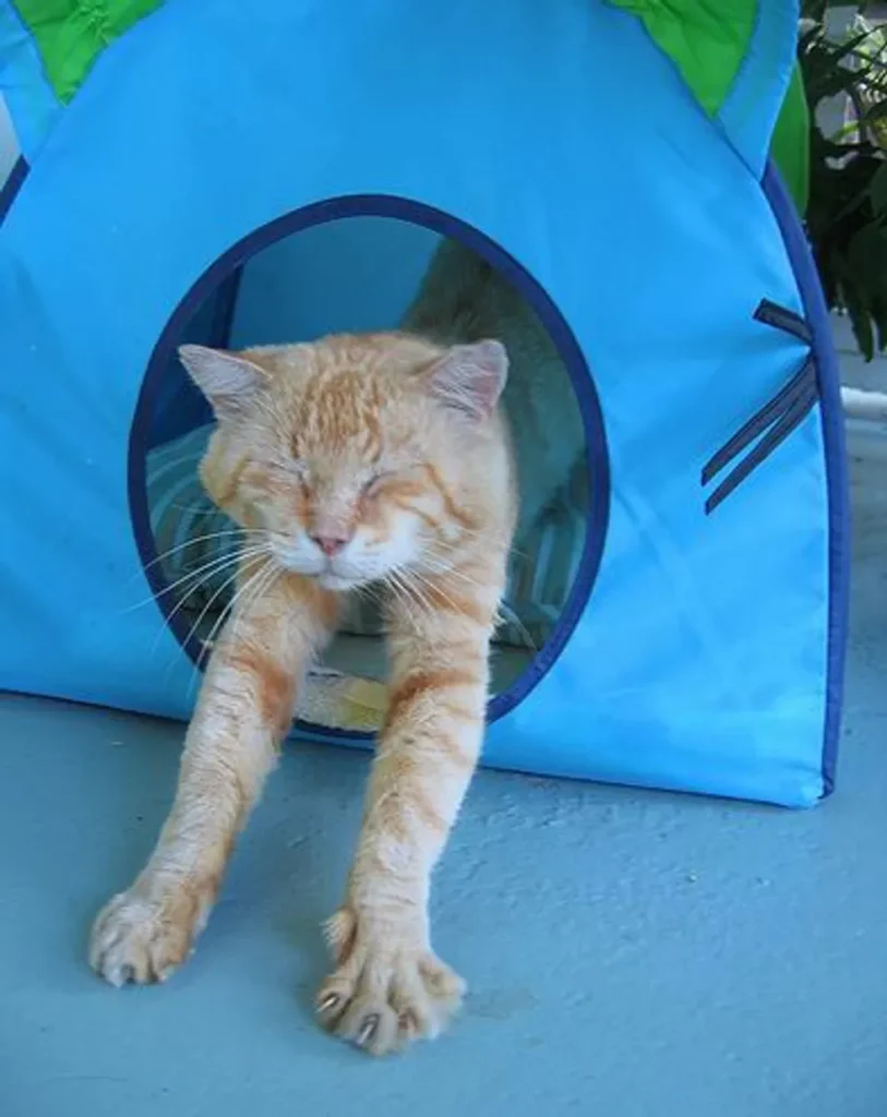 The second & third winters I enclosed half of the porch to provide him with a warm, dry shelter over the winter. It works out very well. He loves his “apartment;” it has a cat door. I spend time with him every single day, at least twice a day, sometimes napping with him on his favorite cot in the “apartment.” He jumps up there with me and plops down on my head, purring like a giant lawnmower. He rubs his big fat cheeks on my face and makes little sounds to show his appreciation and affection for me. To me that makes it all worthwhile.